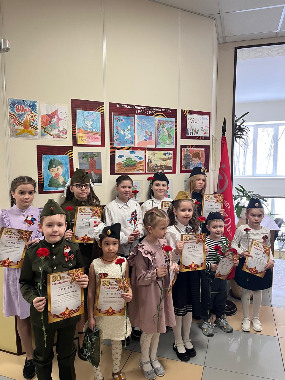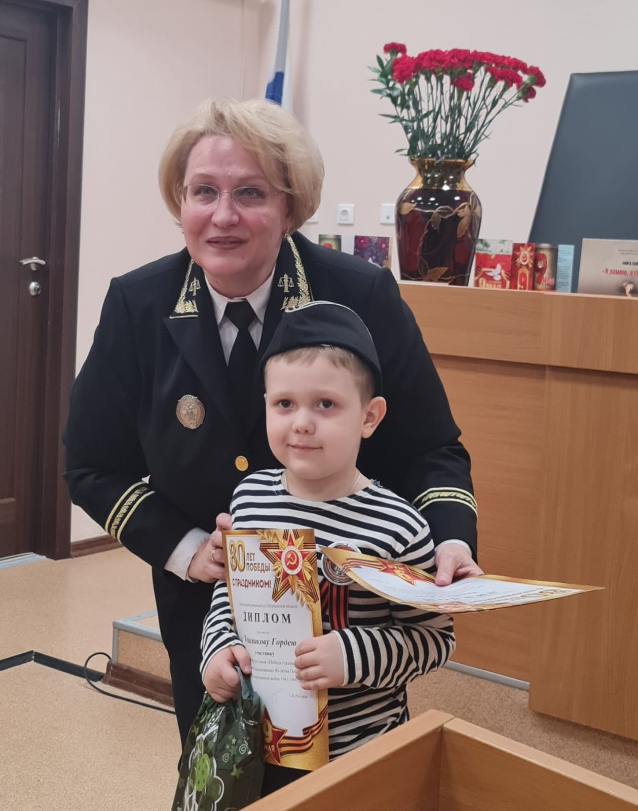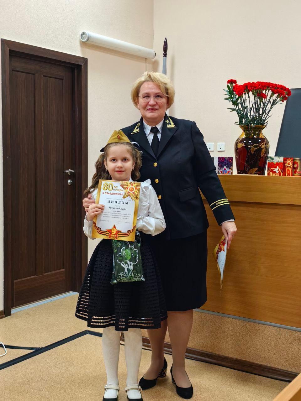 7 мая 2025 года в Североморском районном суде Мурманской области состоялось торжественное собрание, посвящённое празднованию 80-летия Победы в Великой Отечественной войне 1941-1945 гг., на котором также были подведены итоги конкурса детских рисунков "Победа глазами детей". Открыла торжественное мероприятие председатель суда Роговая Татьяна Владимировна поздравлением всех судей и сотрудников аппарата суда, а также детей-участников конкурса с Праздником Победы, рассказала, как важно спустя годы хранить память о всех тех, кто сражался за нашу Родину. Дети также приняли активное участие в мероприятии: многие подготовили стихи о войне, о Великой Победе и с душой, выражением и трепетом прочли их перед коллективом суда. Сердца всех слушателей покорил самый юный участник - Тощевиков Гордей. После выступлений детей перешли к самому главному и трепетному моменту - награждению победителей конкурса. Распоряжением председателя от 17 марта 2025 года утверждено Положение о проведении конкурса детских рисунков "Победа глазами детей" среди детей судей и сотрудниов аппарата суда. В конкурсе рисунков приняли участие 14 детей в возрасте от 4 до 12 лет. Они выразили свое представление о Великой Отечественной войне в ярких и эмоциональных работах. Конкурсная комиссия при выборе победителей оценивала сюжет, технику и качество исполнения, аккуратность, заполненность рисунка. Победителем в возрастной категории до 7 лет признана Зенцова Татьяна с работой "Голубь мира". В возрастной категории от 8 до 12 лет победителем стала Рабюк Мария с работой "Гвоздика". В связи с тем, что голоса конкурсной комиссии разделились, было принято решение присудить дополнительно Приз симпатий, который достался Коровиной Алёне с ее работой "Вальс Победы". Все победители были награждены дипломами и ценными призами. Остальные ребята также не остались без внимания со стороны конкурсной комиссии - им были вручены дипломы участников и памятные подарки. Также все участники конкурса получили символы Победы - Георгиевские ленты и памятные значки. Татьяна Владимировна выразила благодарность родителям за патриотическое воспитание детей, предложила в дальнейшем сохранить традицию проведения подобных конкурсов и принимать в них активное участие.